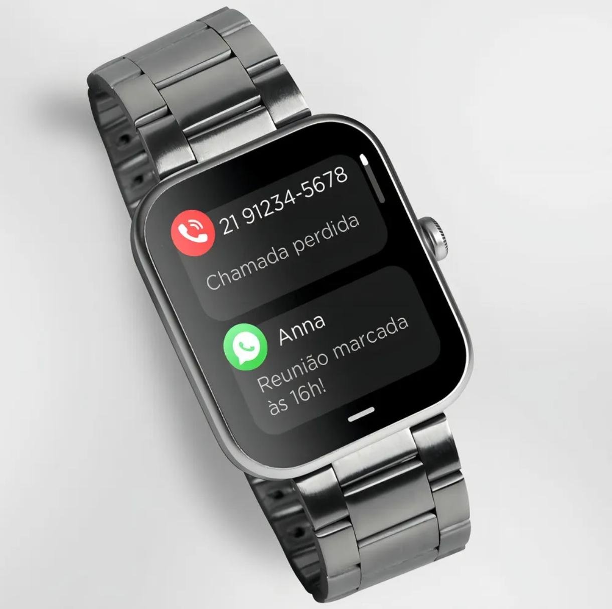 • Notificações: Exibe alertas de chamadas, mensagens de WhatsApp e notificações de redes sociais diretamente no pulso.